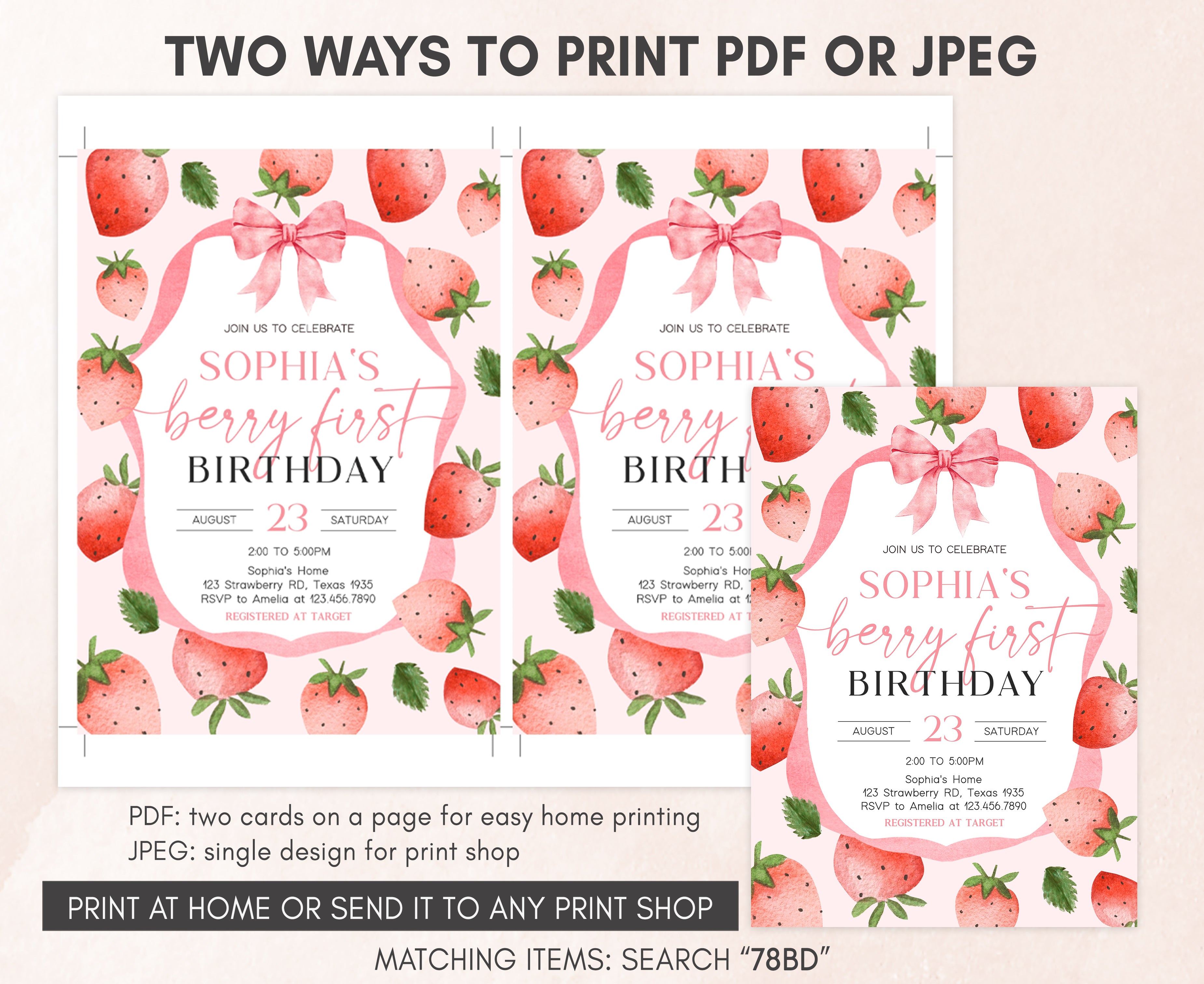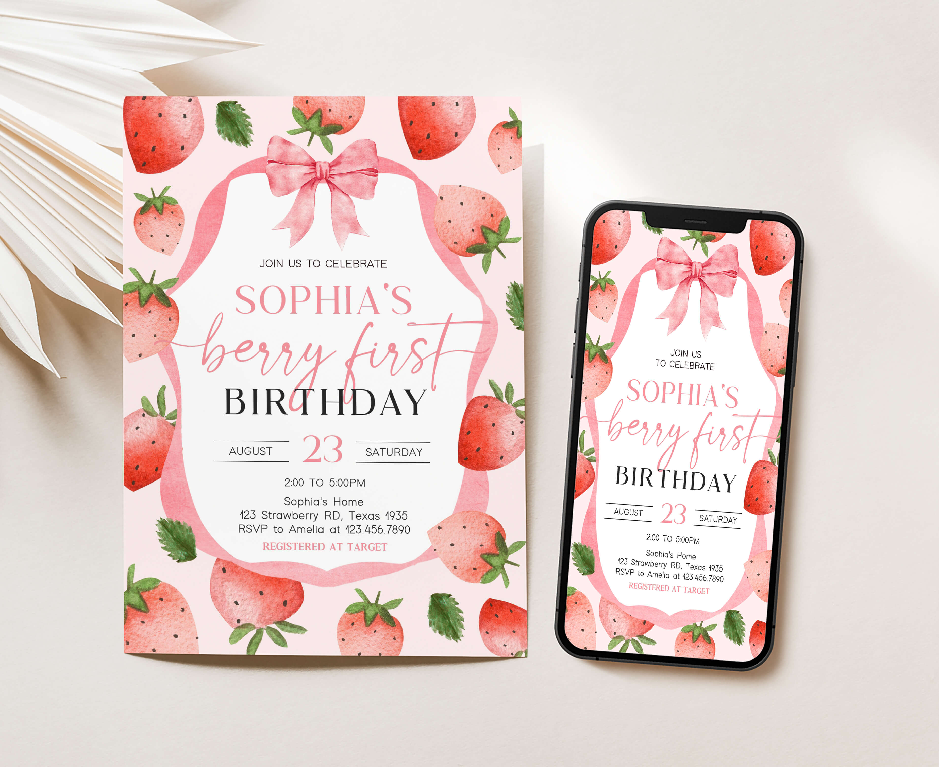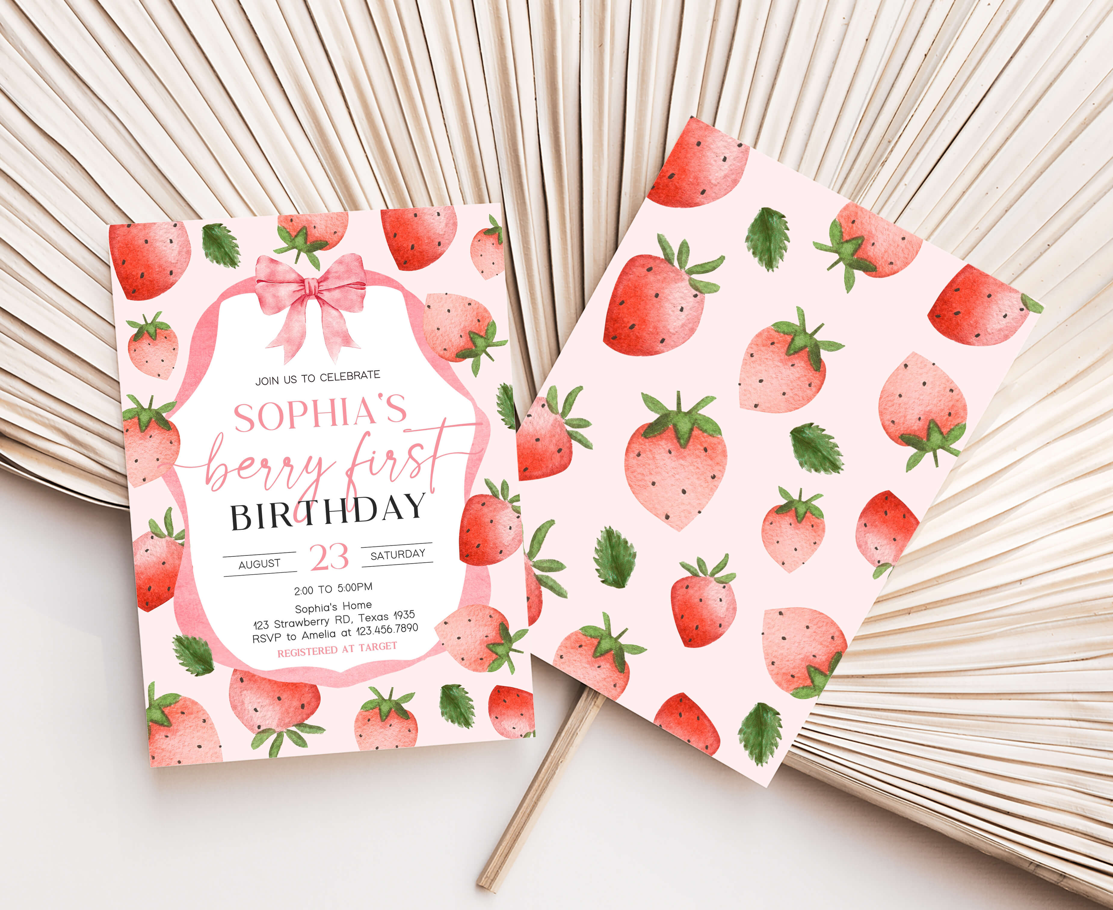 Celebrate with your guests at your Berry First Birthday Party using our delightful Strawberry Bow Ribbon Birthday Invitation. This Girl Strawberry Bash Birthday Invite is the ideal choice to tone for a Berry-themed celebration.