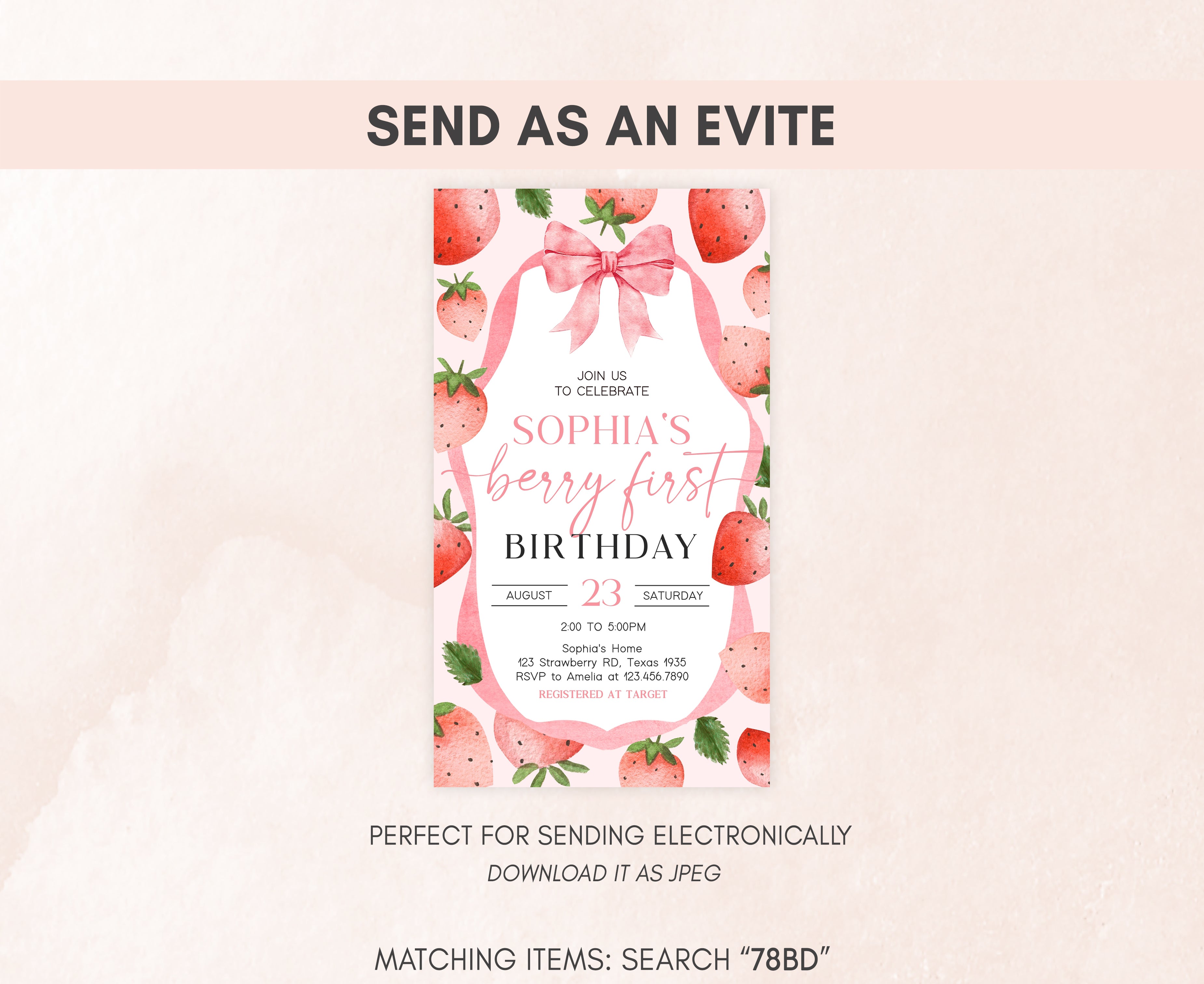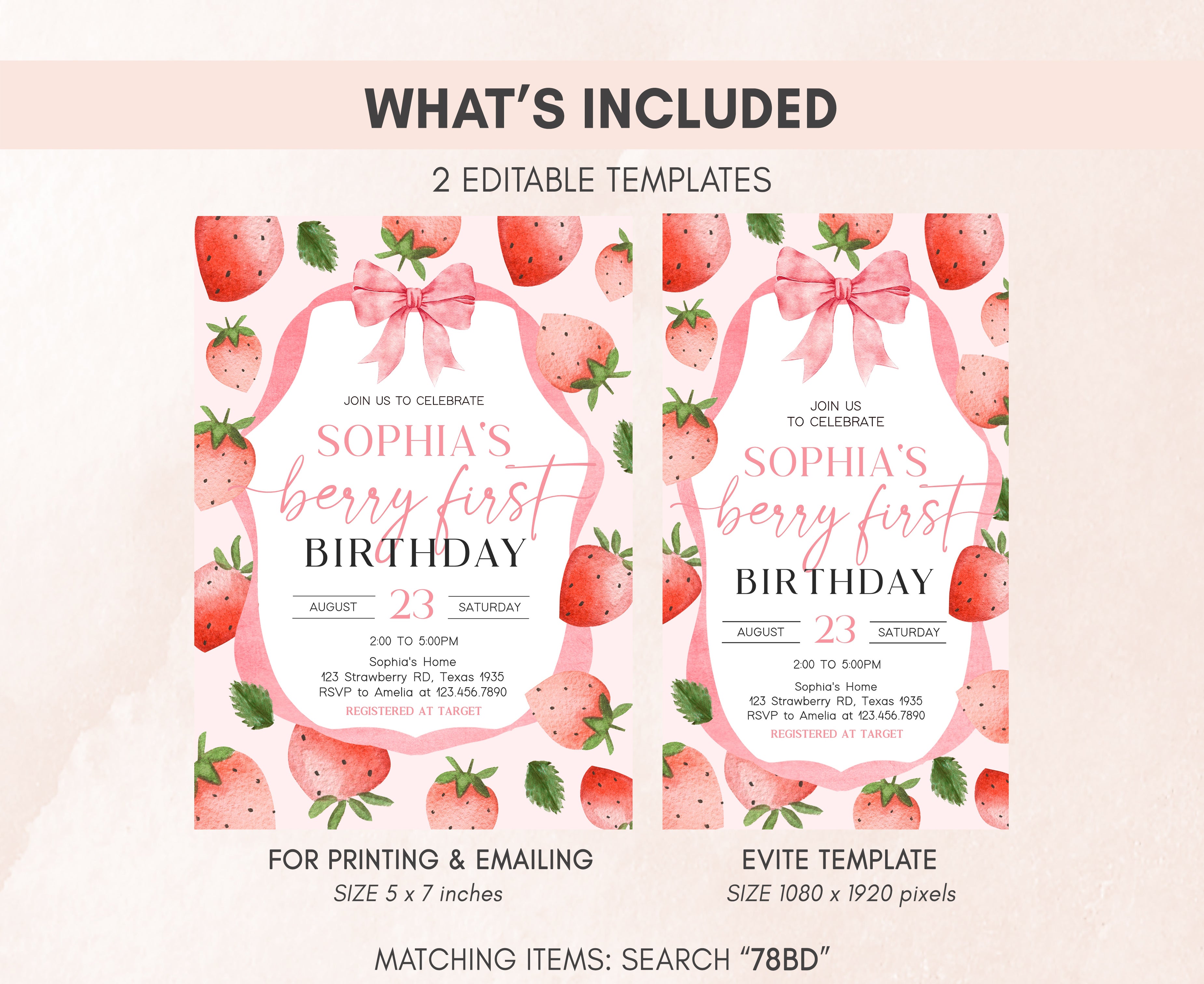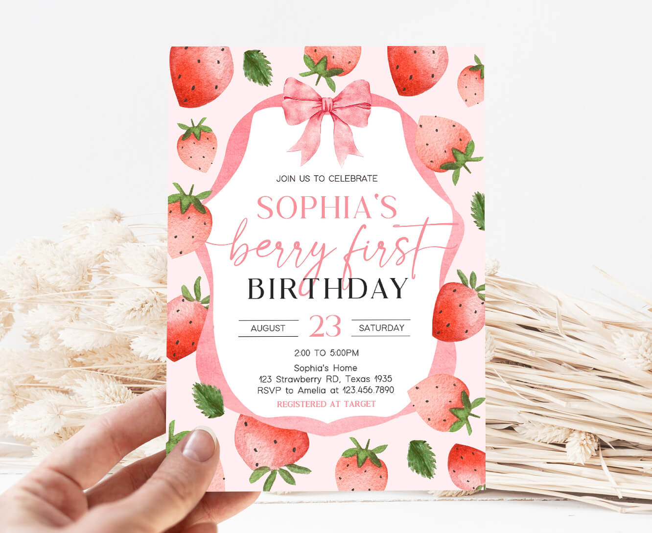 Celebrate with your guests at your Berry First Birthday Party using our delightful Strawberry Bow Ribbon Birthday Invitation. This Girl Strawberry Bash Birthday Invite is the ideal choice to tone for a Berry-themed celebration.