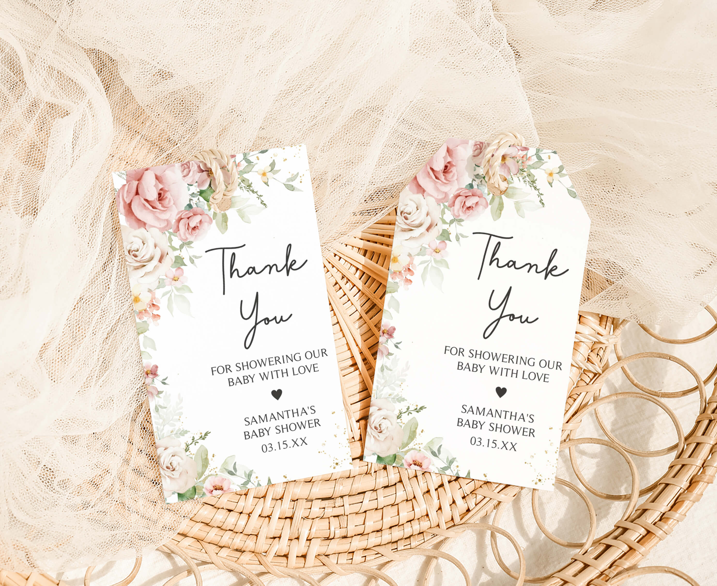 Amplify the charm of your Spring Flower Baby Shower party favors by adding a personal touch with our delightful Baby Girl is on Her Way Baby Shower Gift Tags. These Blush Pink Floral Spring Thank you Tags are the perfect way to express your gratitude to your guests in a special and heartfelt manner.