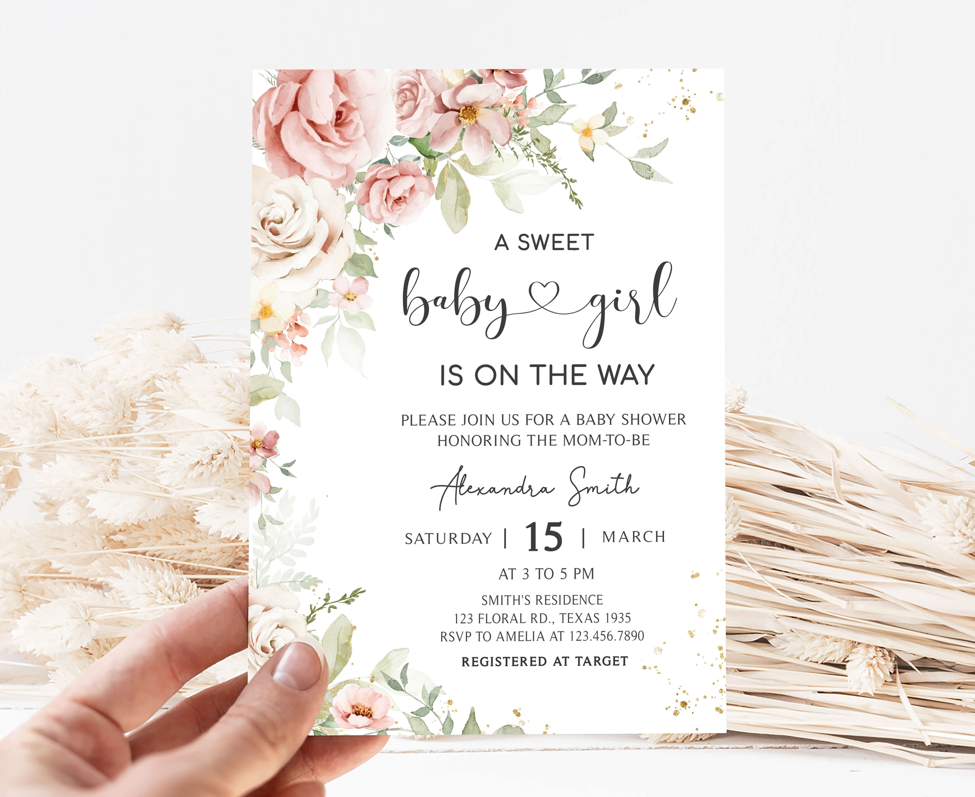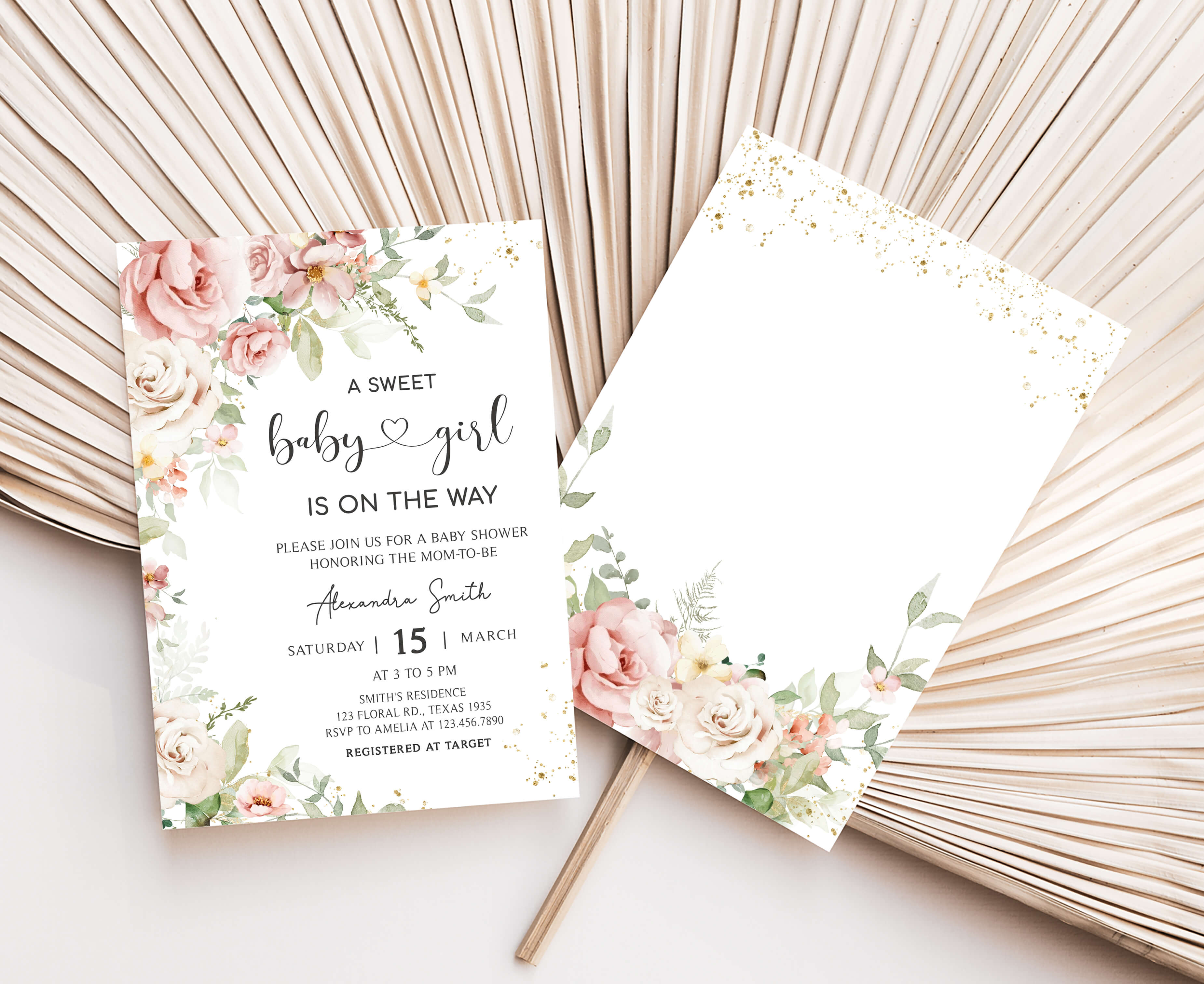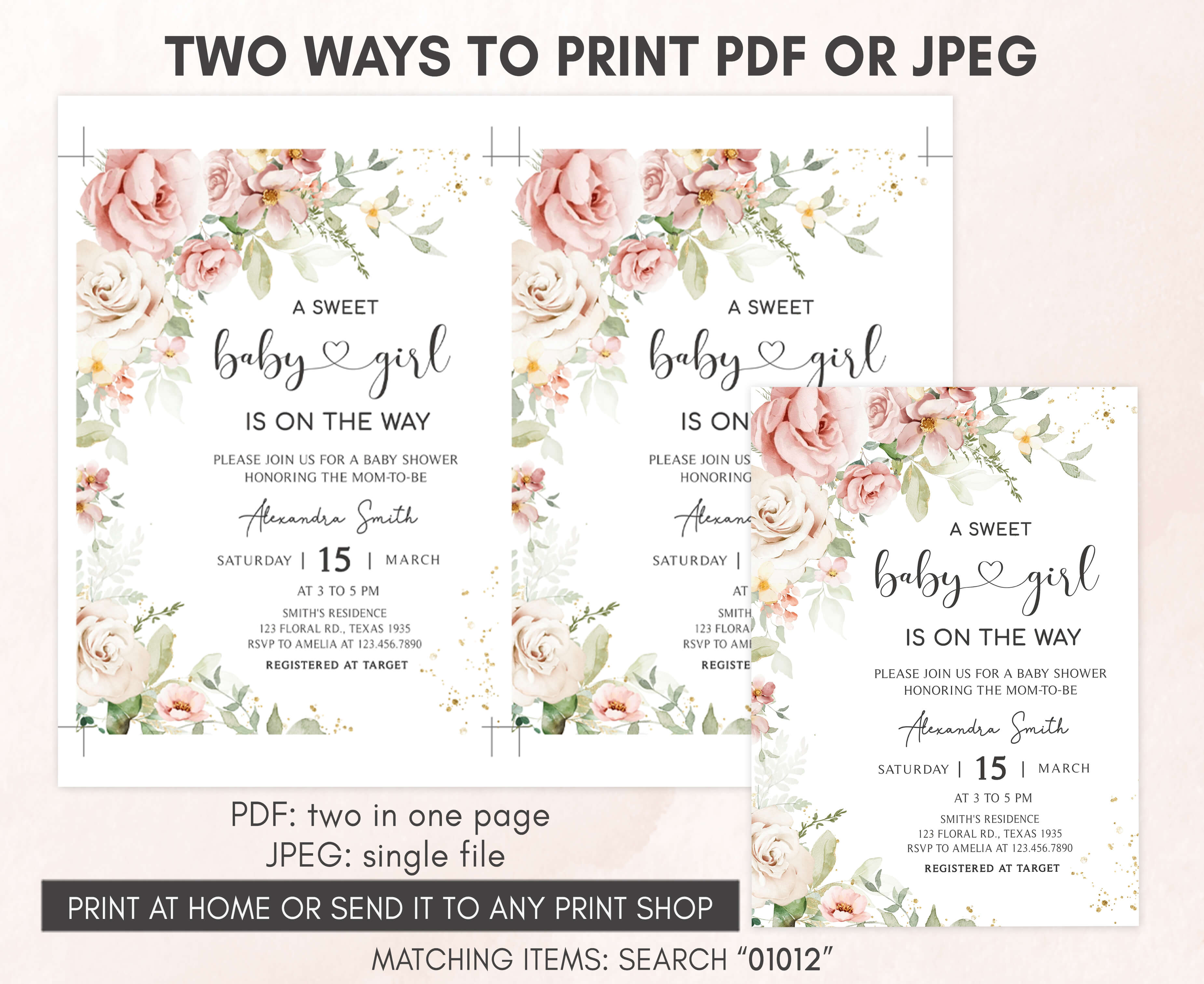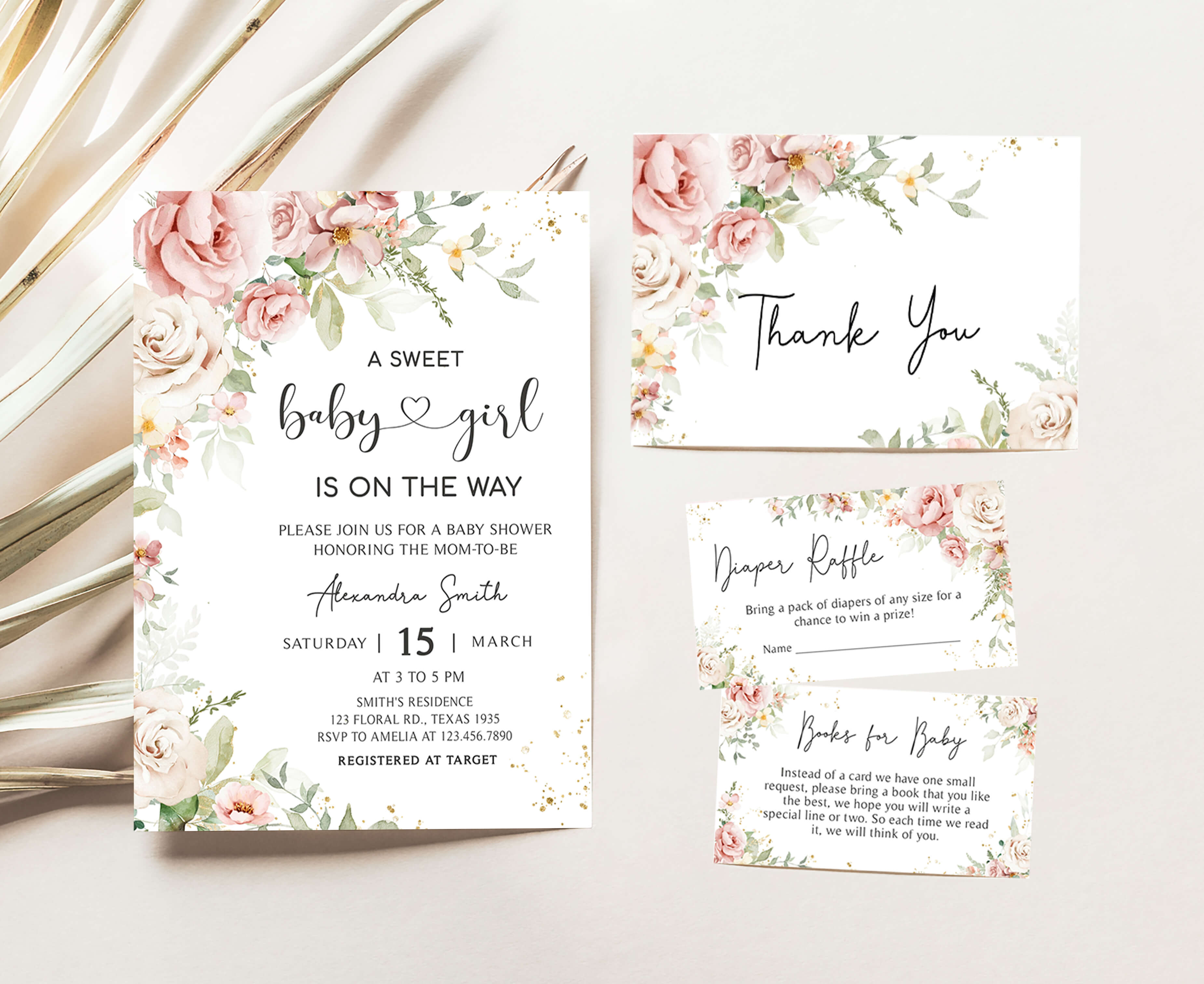 Celebrate with your guests at your Spring Flower Baby Shower Party using our delightful Baby Girl is on Her Way Baby Shower Invitation Bundle. This Blush Pink Floral Spring Baby Shower Invite is the ideal choice to set the tone for a Floral-themed celebration.