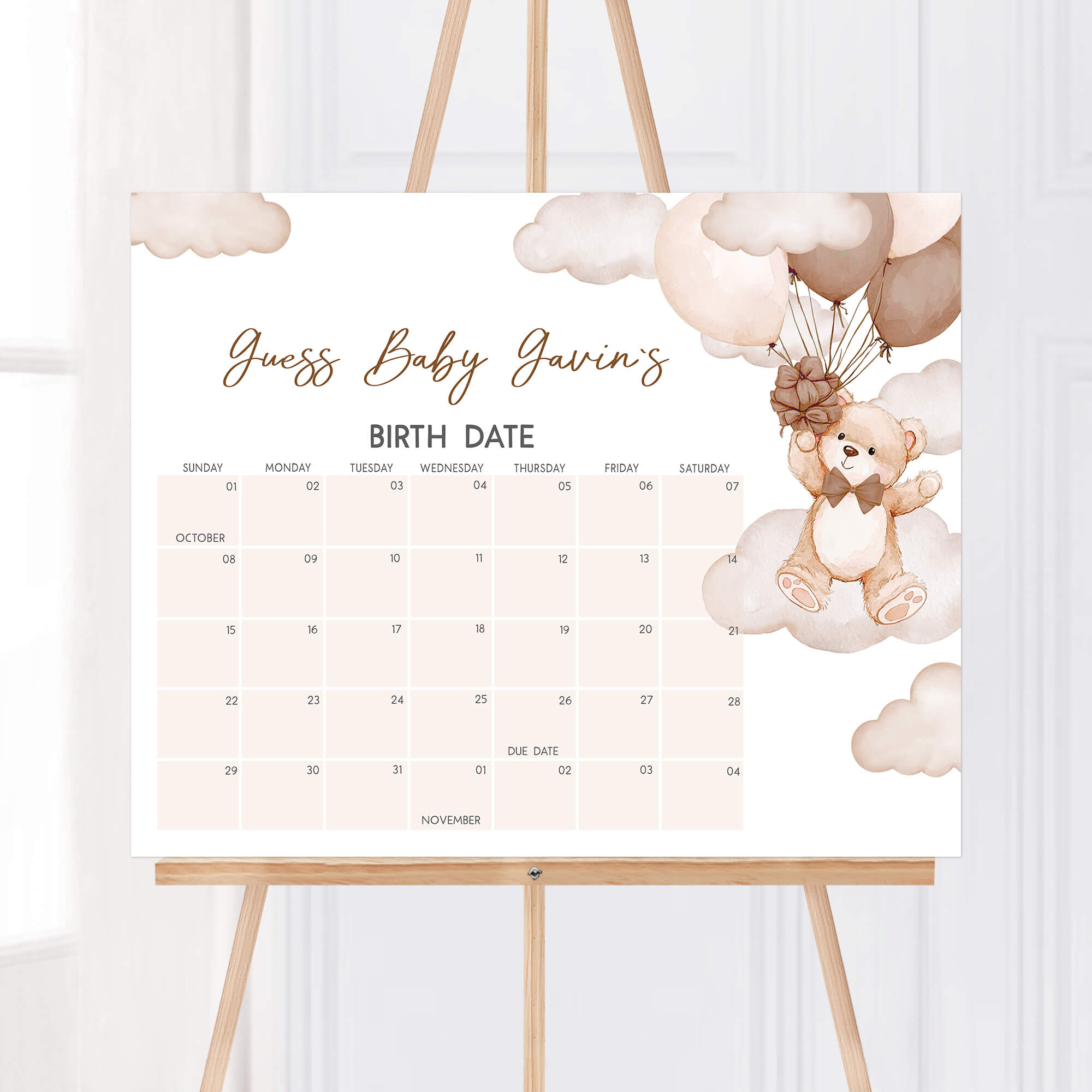 Partake in the excitement of your Bear Cloud Baby Shower Party with our We Can Bearly Wait Due Date Game! Embrace the adorable spirit of the Brown Balloon Bear Baby Shower party as guests make their predictions for the due date, coming together to share in the anticipation of the upcoming arrival. Complete the joy and fun with this Bear Baby Shower Birthday Predictions.