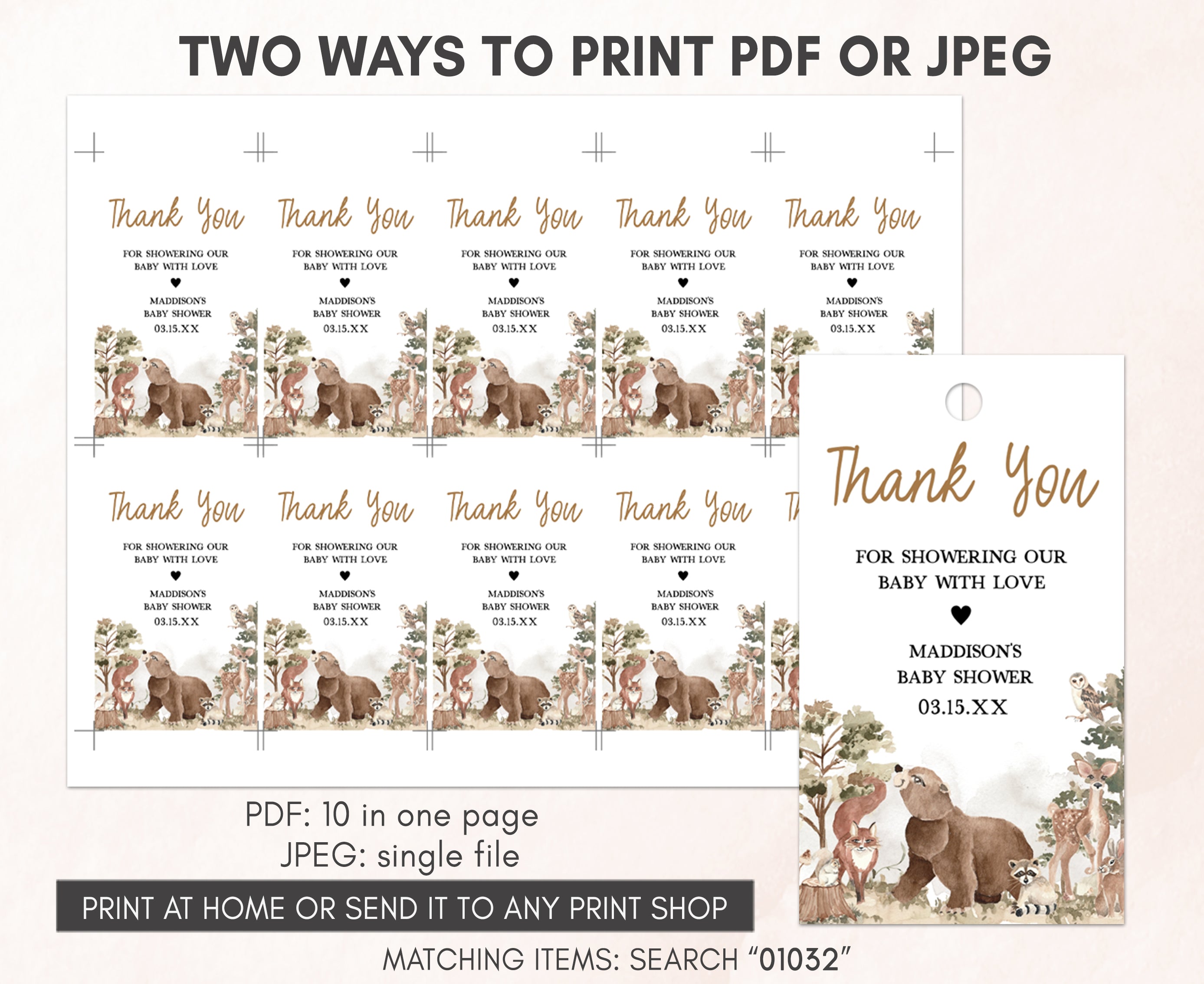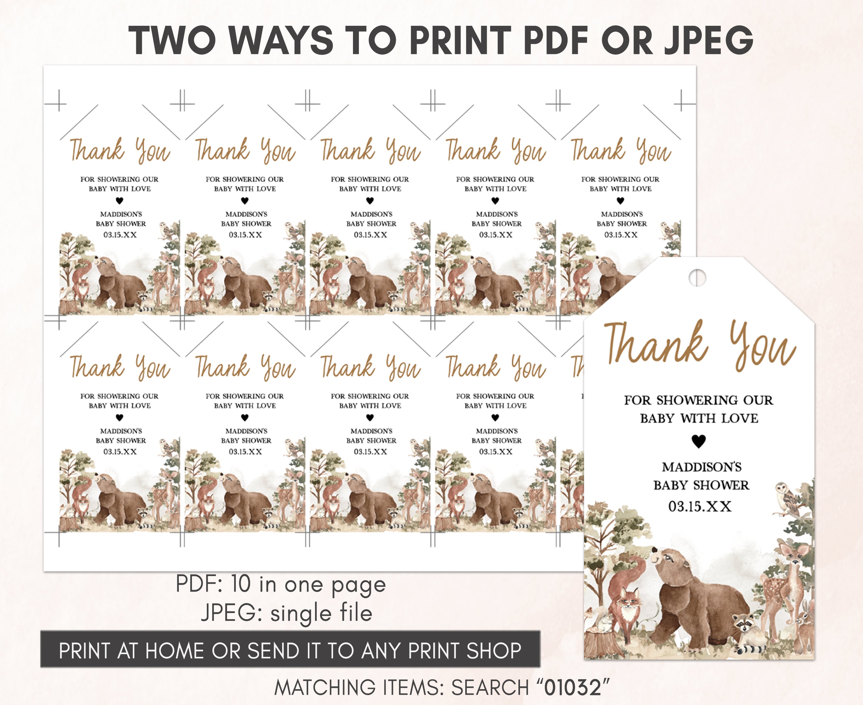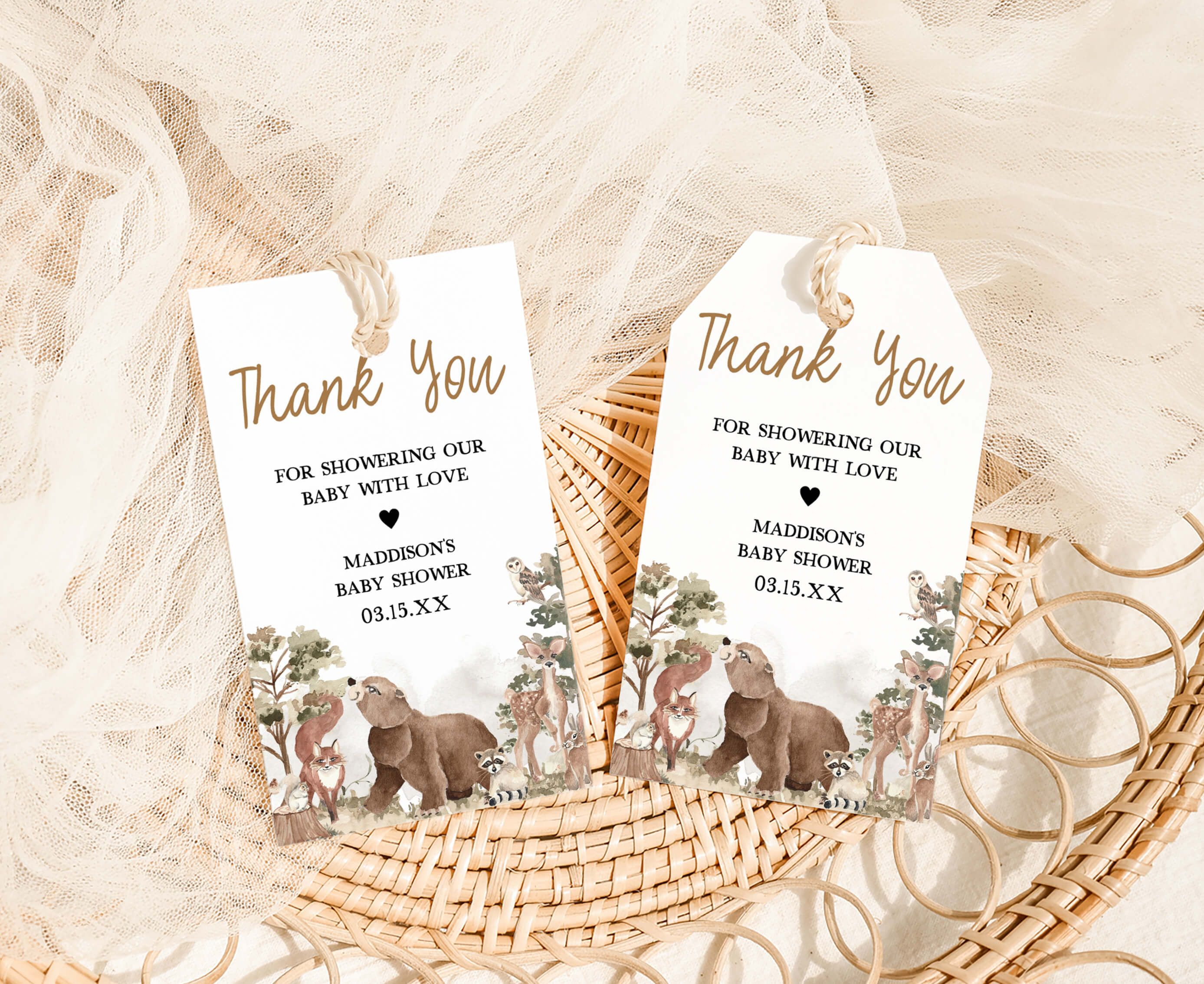 Amplify the charm of your Rustic Nature Baby Shower party favors by adding a personal touch with our delightful Forest Animals Baby Shower Gift Tags. These Gender Neutral Woodland Thank you Tags are the perfect way to express your gratitude to your guests in a special and heartfelt manner.