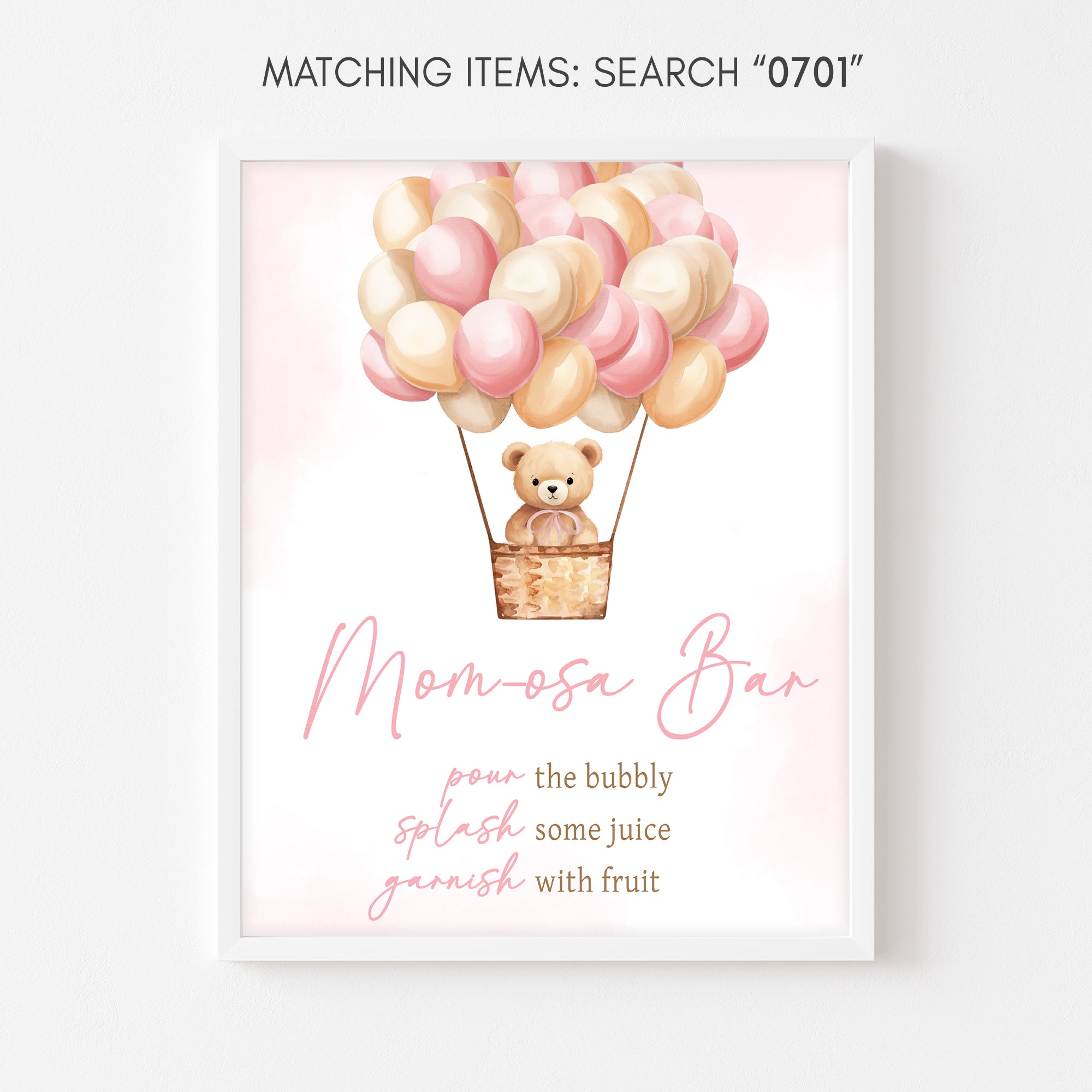 Craft an ideal atmosphere for your Pink Bear Hot Air Balloon Baby Shower Party using our enchanting Brown Bear Baby Shower Mimosa Sign Printable. These prints not only add a touch of charm but also serve as helpful guides, directing guests to various Boho Bear Balloon party sections with their delightful designs.