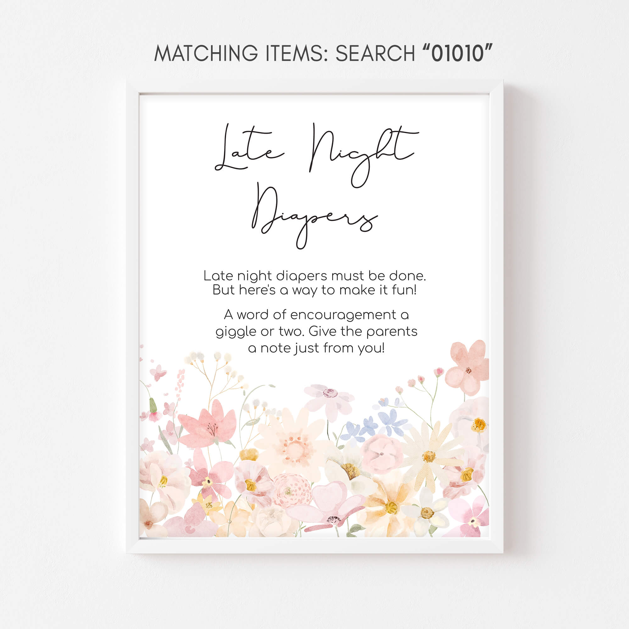 Craft an ideal atmosphere for your Garden Flower Baby Shower Party using our enchanting A Little Wildflower is on the Way Baby Shower Diaper Thoughts Sign Printable. These prints not only add a touch of charm but also serve as helpful guides, directing guests to various Spring Wildflower party sections with their delightful designs.