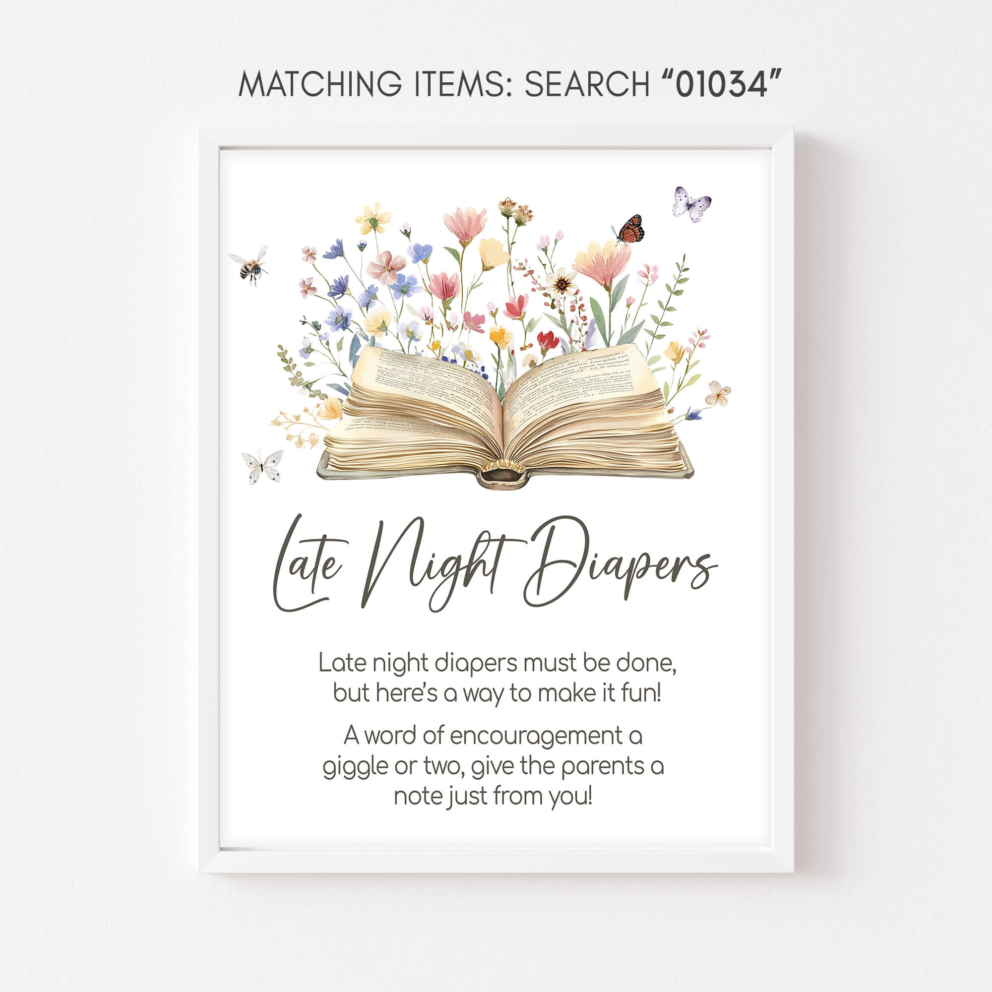 Craft an ideal atmosphere for your Spring Flowers Baby Shower Party using our enchanting Floral Storybook Baby Shower Diaper Thoughts Sign Printable. These prints not only add a touch of charm but also serve as helpful guides, directing guests to various Butterfly Spring Book party sections with their delightful designs.