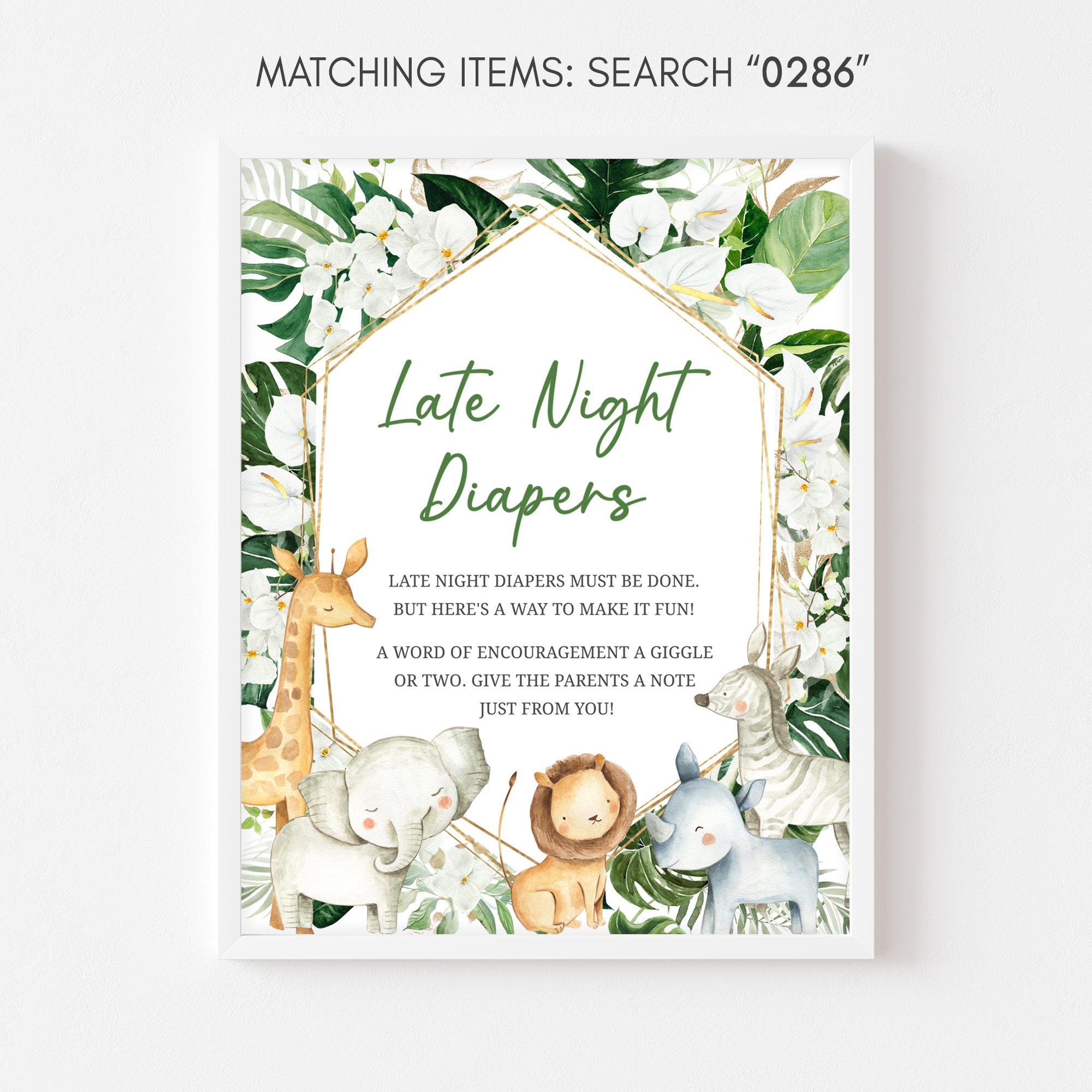 Craft an ideal atmosphere for your Greenery Jungle Baby Shower Party using our enchanting Safari Baby Shower Diaper Thoughts Sign Printable. These prints not only add a touch of charm but also serve as helpful guides, directing guests to various Safari Animals party sections with their delightful designs.