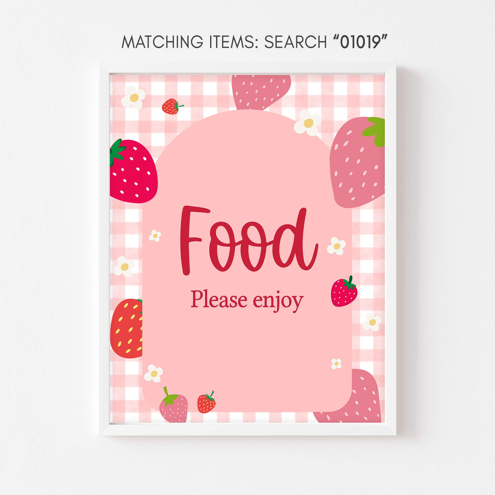 Craft an ideal atmosphere for your Pink Gingham Strawberry Baby Shower Party using our enchanting Berry Sweet on the Way Baby Shower Food Table Sign Printable. These prints not only add a touch of charm but also serve as helpful guides, directing guests to various Spring Summer Strawberry party sections with their delightful designs.