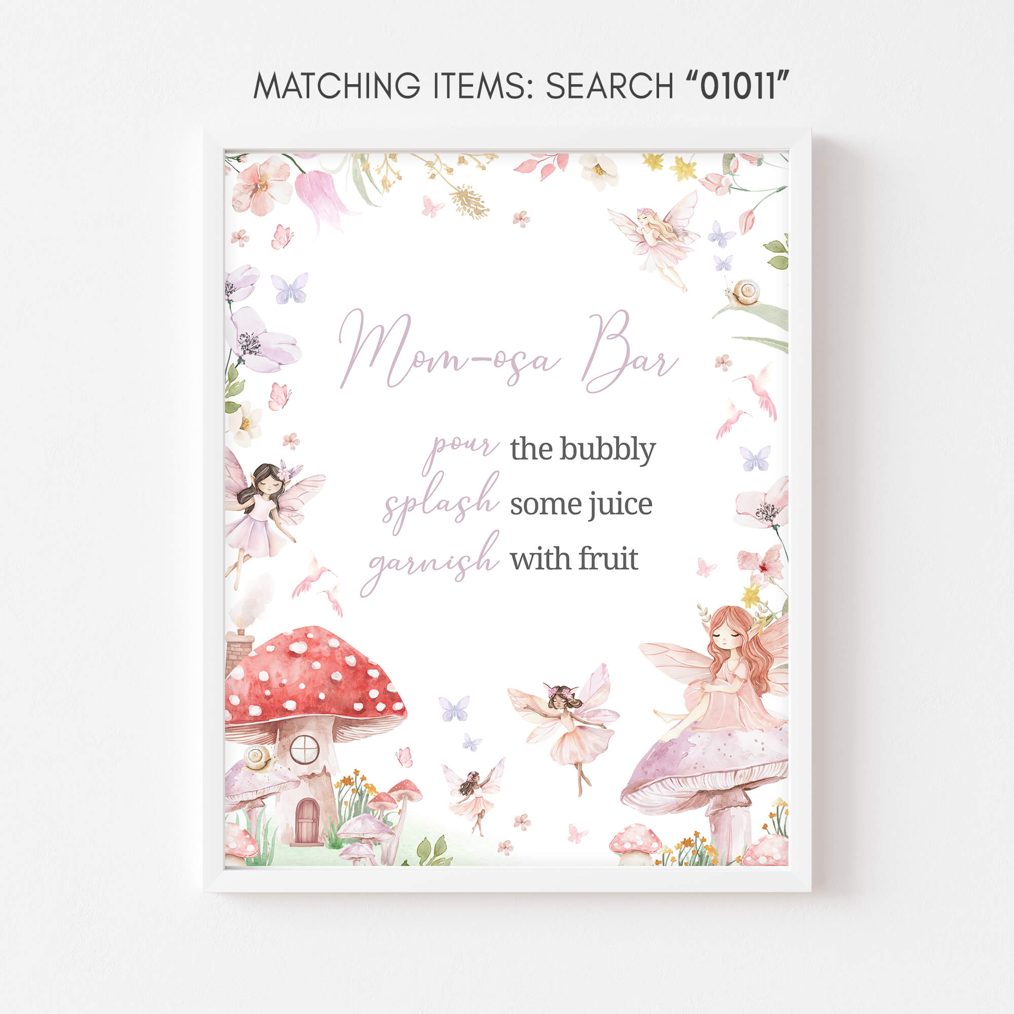 Craft an ideal atmosphere for your Enchanted Garden Baby Shower Party using our enchanting A Little Fairy is on Her Way Baby Shower Mimosa Sign Printable. These prints not only add a touch of charm but also serve as helpful guides, directing guests to various Floral Forest Fairy party sections with their delightful designs.