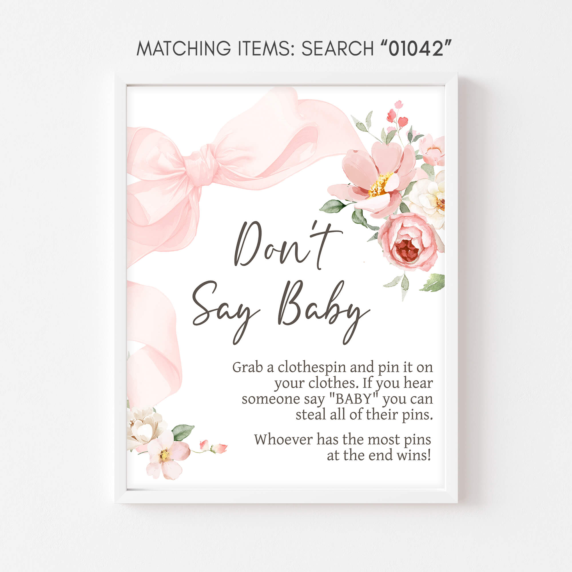Craft an ideal atmosphere for your Girl Flowers Baby Shower Party using our enchanting Pastel Coquette Ribbon Baby Shower Don't Say Baby Game Sign Printable. These prints not only add a touch of charm but also serve as helpful guides, directing guests to various Pink Baby in Bloom party sections with their delightful designs.