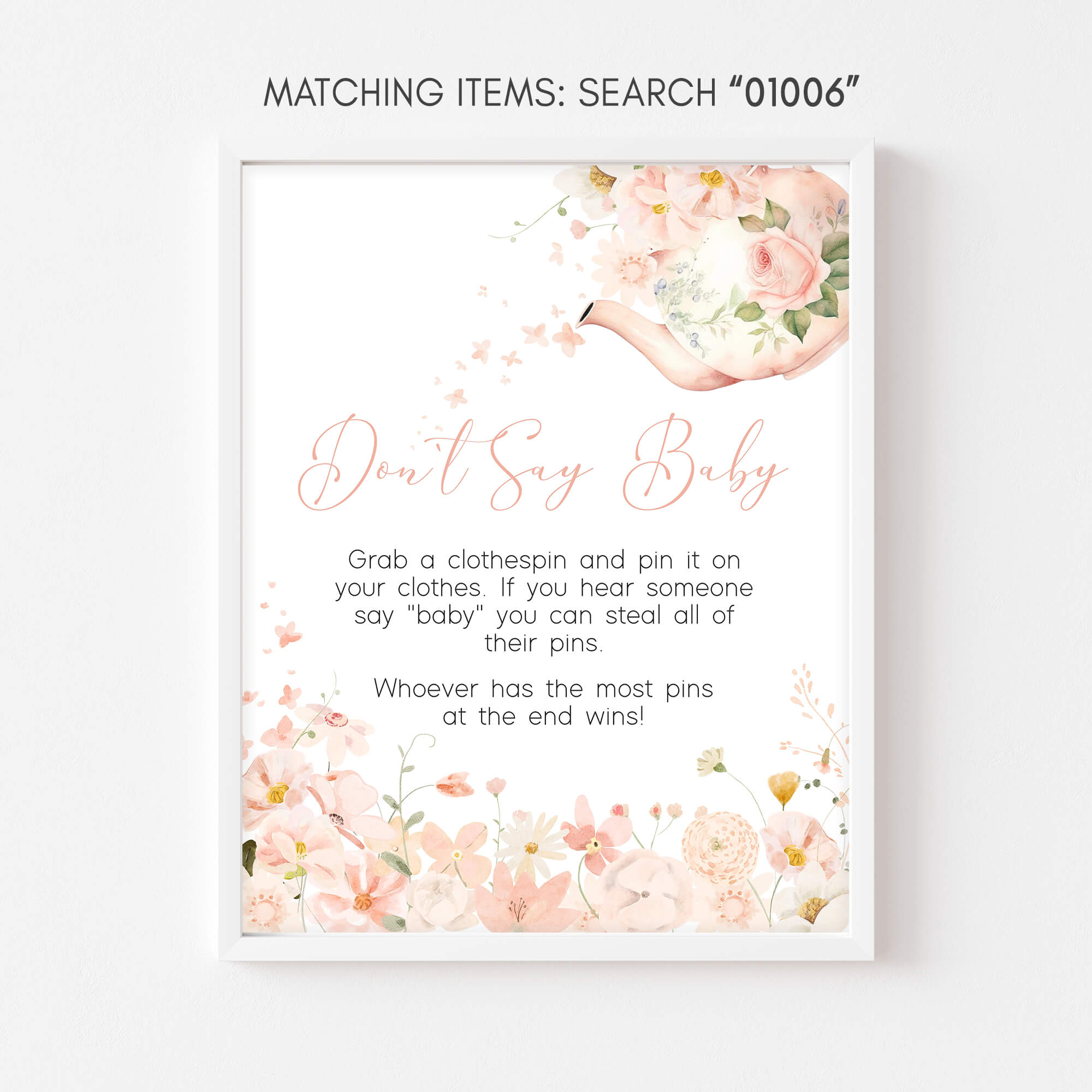 Craft an ideal atmosphere for your Floral Spring Baby Shower Party using our enchanting Garden Tea Party Baby Shower Don't Say Baby Game Sign Printable. These prints not only add a touch of charm but also serve as helpful guides, directing guests to various Floral Tea Pot party sections with their delightful designs.