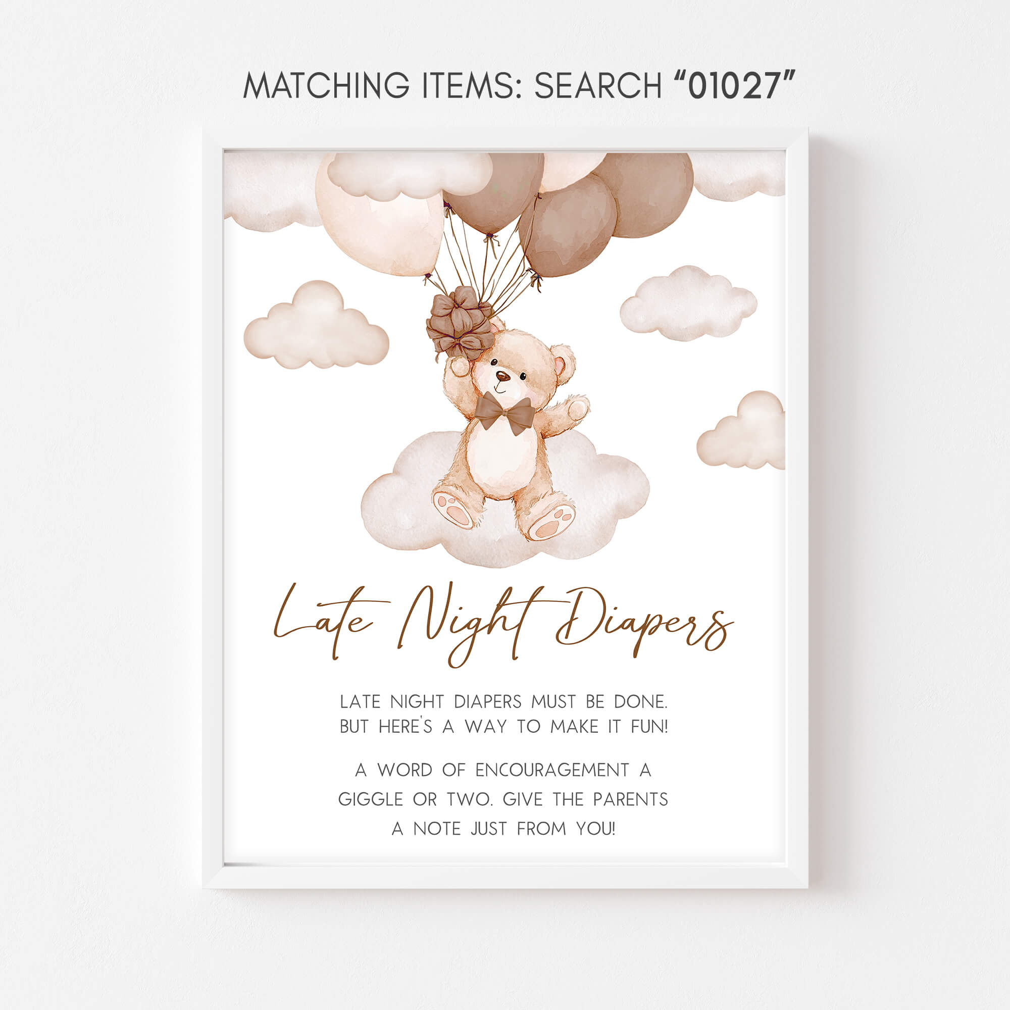 Craft an ideal atmosphere for your Bear Cloud Baby Shower Party using our enchanting We Can Bearly Wait Baby Shower Diaper Thoughts Sign Printable. These prints not only add a touch of charm but also serve as helpful guides, directing guests to various Brown Balloon Bear party sections with their delightful designs.